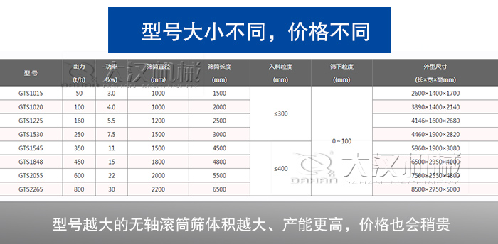 該設(shè)備型號有多種,每種型號的設(shè)備機(jī)重、體積、效率、產(chǎn)能、電機(jī)功率等各不一樣,型號越大的無軸滾筒篩體積越大、產(chǎn)能更高,價(jià)格也會稍貴些,不過給客戶帶來的經(jīng)濟(jì)利潤將會更顯著;反之,型號小的無軸滾筒篩價(jià)格低,適合于小規(guī)模企業(yè),效益較大型號設(shè)備低些。