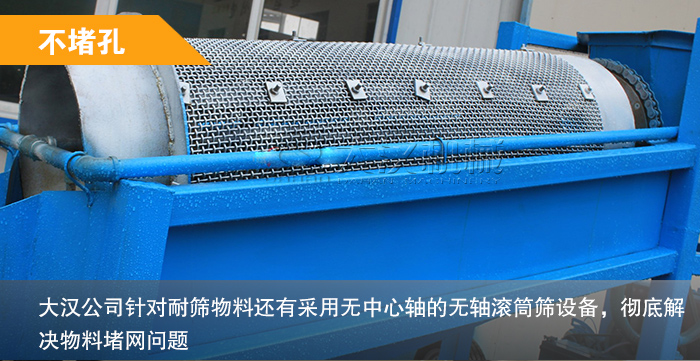 建筑垃圾形態(tài)不一,物料內(nèi)還還有大量的雜質(zhì),使用普通振動(dòng)篩根本無法克服篩孔堵塞這一現(xiàn)象,而滾筒篩分機(jī)可設(shè)有梳型清篩機(jī)構(gòu),在篩分過程中,不管進(jìn)入篩分筒的物料多臟、多雜都可以篩分,從而提高了設(shè)備的篩分效率,我們大漢公司針對耐篩物料還有采用無中心軸的無軸滾筒篩設(shè)備,解決物料堵網(wǎng)問題。