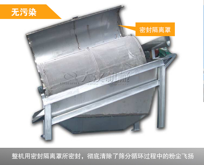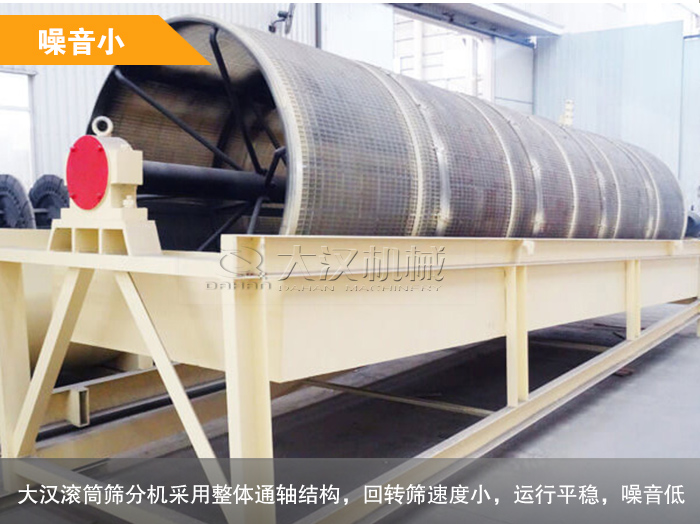 大漢滾筒篩分機(jī)采用整體通軸結(jié)構(gòu),回轉(zhuǎn)篩速度小,運(yùn)行平穩(wěn),并且有密封隔離罩與外界隔離,減低工作噪音。