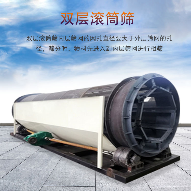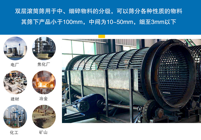 雙層滾筒篩用于中、細(xì)碎物料的分級,可以篩分各種性質(zhì)的物料,可以克服振動篩在篩分潮濕性物料的堵塞問題,其篩下產(chǎn)品小于100mm,中間為10~50mm,細(xì)至3mm以下。廣泛應(yīng)用于電廠、焦化廠、建材、冶金、化工、礦山等行業(yè)。
