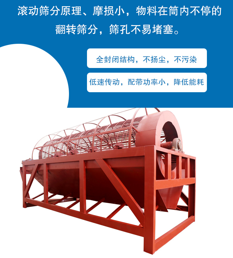 1、滾動篩分原理、摩損小,物料在筒內(nèi)不停的翻轉(zhuǎn)篩分,篩孔不易堵塞。