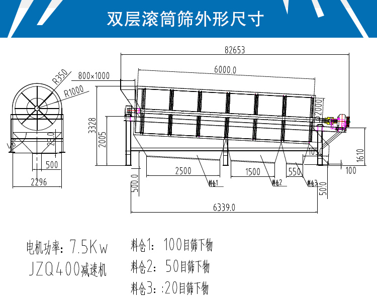 雙層滾筒篩主要由電機(jī)、減速機(jī)、滾筒裝置、機(jī)架、密封蓋、進(jìn)出料口組成,下面詳細(xì)介紹以下幾個(gè)部分: