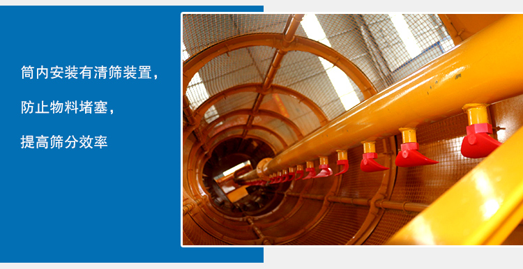 5、筒內(nèi)安裝有清篩裝置,防止物料堵塞,提高篩分效率。