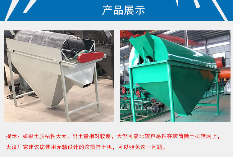 提示:如果土質(zhì)粘性太大,出土量相對較差,太濕可能比較容易粘在滾筒篩土機(jī)篩網(wǎng)上,大漢廠家建議您使用無軸設(shè)計的滾筒篩土機(jī),可以避免這一問題。