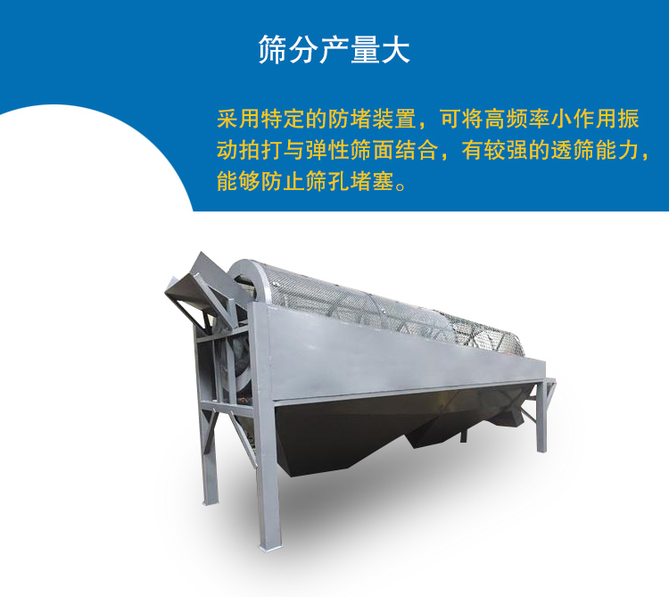 1、采用特定的防堵裝置,可將高頻率小作用振動拍打與彈性篩面結(jié)合,有較強的透篩能力,能夠防止篩孔堵塞。