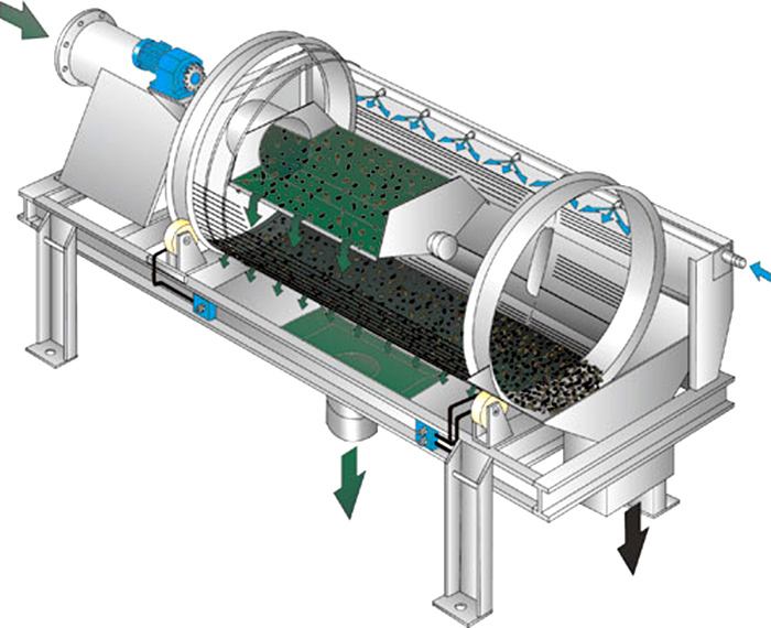 當(dāng)物料進入滾筒裝置后,由于滾筒裝置的傾斜與轉(zhuǎn)動,使篩面上的物料翻轉(zhuǎn)與滾動,使合格物料(篩下產(chǎn)品)經(jīng)滾筒后端底部的出料口排出,不合格的物料(篩上產(chǎn)品)經(jīng)滾筒尾部的排料口排出。由于物料在滾筒內(nèi)的翻轉(zhuǎn)、滾動,使卡在篩孔中的物料可被彈出,防止篩孔堵塞。