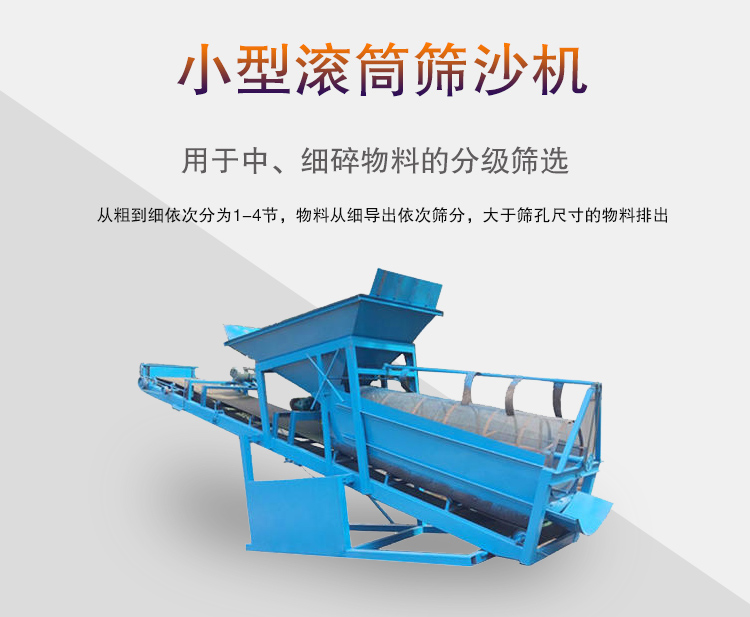 小型滾筒篩啟動后,破碎的石料進入滾筒后,一方面隨著滾筒轉(zhuǎn)動而被篩選,一方面粒度大的石料沿著滾筒的斜度向前流動,通過不同網(wǎng)目的的篩網(wǎng)逐漸被篩出。不大的石料篩出后落入各自的漏斗,然后由人工運出或自流送往成品堆。
