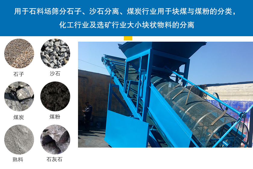 主要用于石料場篩分石子、沙石分離’煤炭行業(yè)用于塊煤與煤粉的分類,化工行業(yè)及選礦行業(yè)大小塊狀物料的分離。