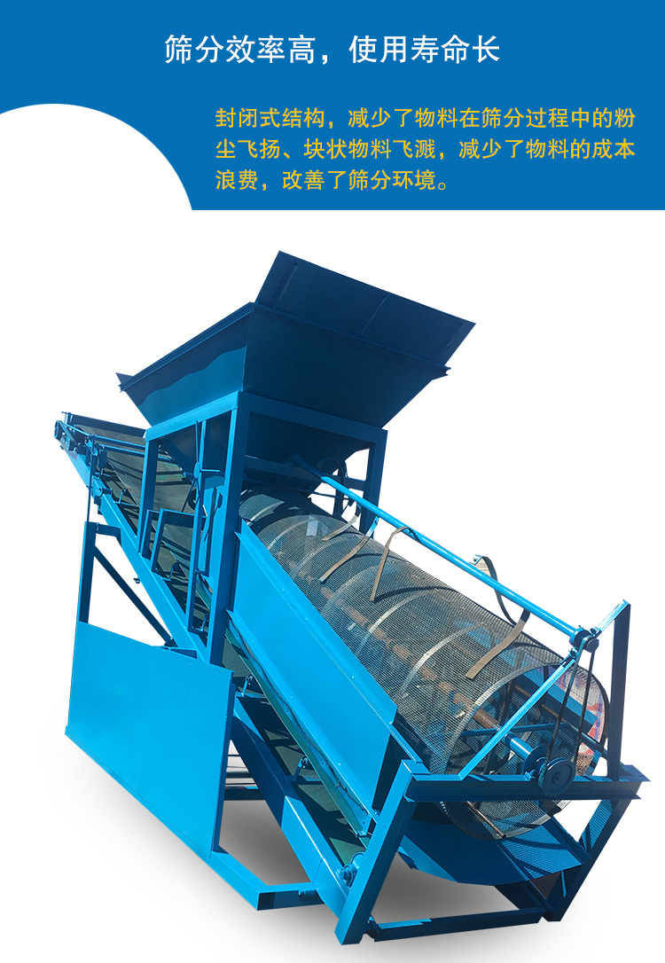 1、物料在篩分過程中不停的翻轉(zhuǎn)滾筒,可以減少物料堵塞,通過增加梳型清篩裝置,也可有效降低堵網(wǎng)風險,提高篩分效率。