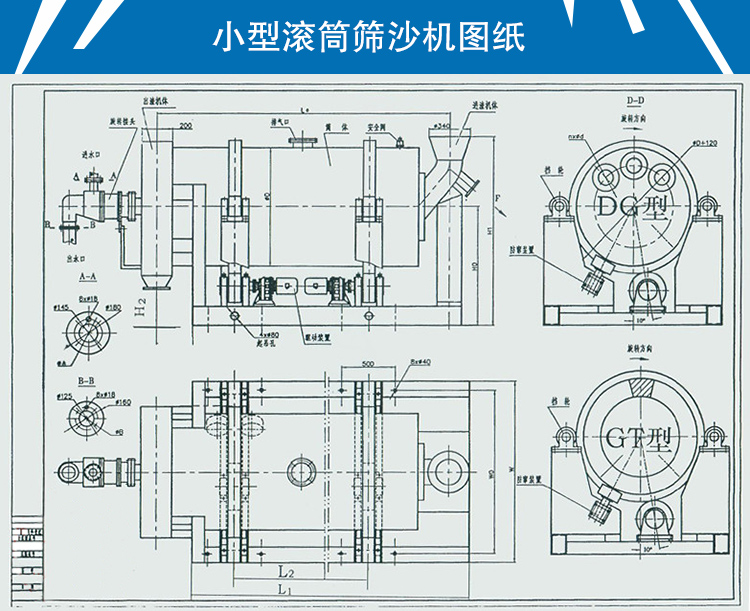 小型滾筒篩沙機主要由中心滾筒、機架、漏斗、減速機、電動機等五個主要部分組成。