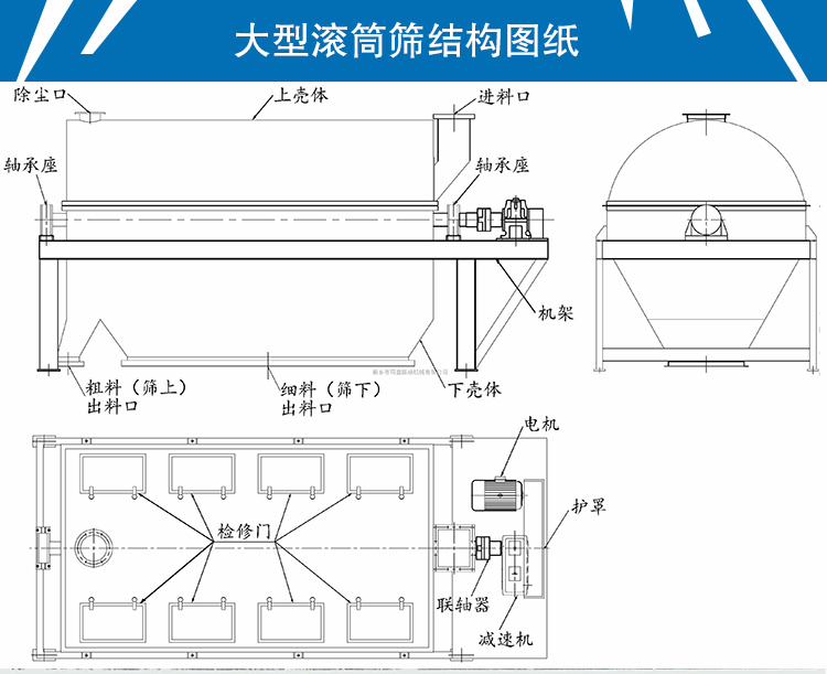 大型滾筒篩主要有電機、減速機、滾筒裝置、機架、密封蓋、進出料口組成。滾筒裝置傾斜安裝于機架上。電動機經(jīng)減速機與滾筒裝置通過聯(lián)軸器連接在一起,驅(qū)動滾筒裝置繞其軸線轉(zhuǎn)動。