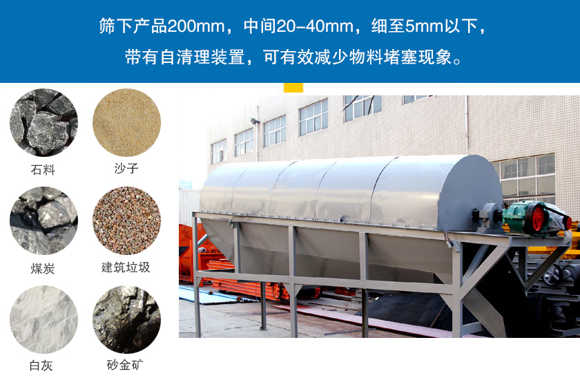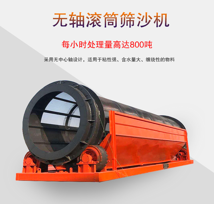 無軸滾筒篩沙機(jī)適合篩分石料、沙子、建筑垃圾及潮濕易堵塞的物料,廣泛用于冶金、建材、煤炭、化工等行業(yè),篩下產(chǎn)品200mm,中間20-40mm,細(xì)至5mm以下,帶有自清理裝置,可有效減少物料堵塞現(xiàn)象。