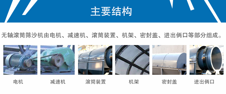 無軸滾筒篩沙機(jī)由電機(jī)、減速機(jī)、滾筒裝置、機(jī)架、密封蓋、進(jìn)出料口等部分組成。