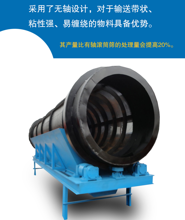 無軸滾筒篩沙機(jī)簡稱無軸滾筒篩,與有軸滾筒篩相比,由于采用無中心軸設(shè)計,適用于粘性強(qiáng)、含水量大、纏繞性的物料,如:建筑垃圾、白灰等,由于物料在滾筒內(nèi)的翻轉(zhuǎn)、滾動,使卡在篩孔中的物料可被彈出,防止篩孔堵塞,無軸滾筒篩沙機(jī)的設(shè)計擺脫了普通振動篩在篩分較濕物料是出現(xiàn)的篩孔堵塞問題,提高了設(shè)備的產(chǎn)能和可靠性。