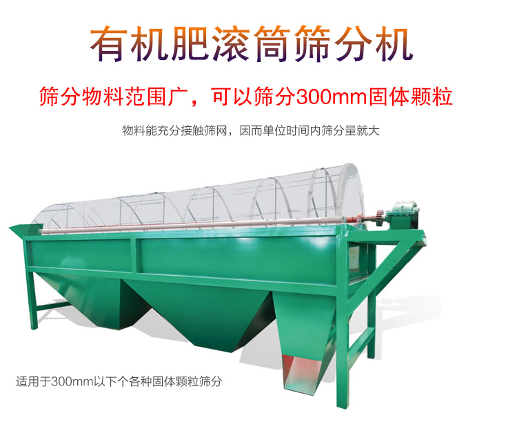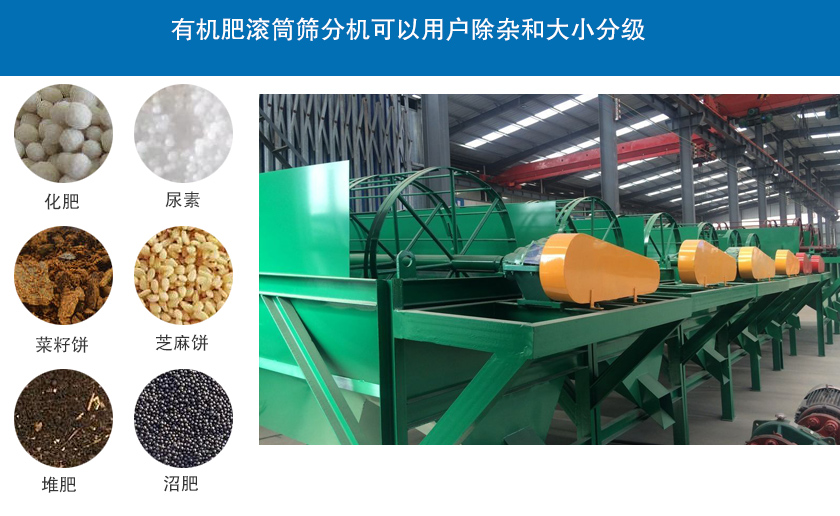 有機(jī)肥滾筒篩分機(jī)可以用戶(hù)除雜和大小分級(jí),主要用于化肥、尿素、菜籽餅、芝麻餅、堆肥、沼肥等各種有機(jī)肥料的處理。