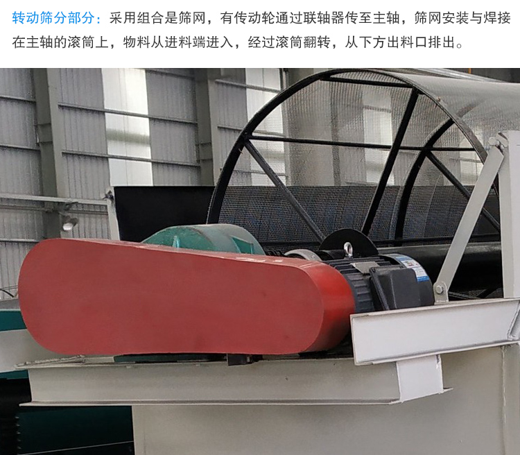 轉(zhuǎn)動(dòng)篩分部分:采用組合是篩網(wǎng),有傳動(dòng)輪通過(guò)聯(lián)軸器傳至主軸,篩網(wǎng)安裝與焊接在主軸的滾筒上,物料從進(jìn)料端進(jìn)入,經(jīng)過(guò)滾筒翻轉(zhuǎn),從下方出料口排出。