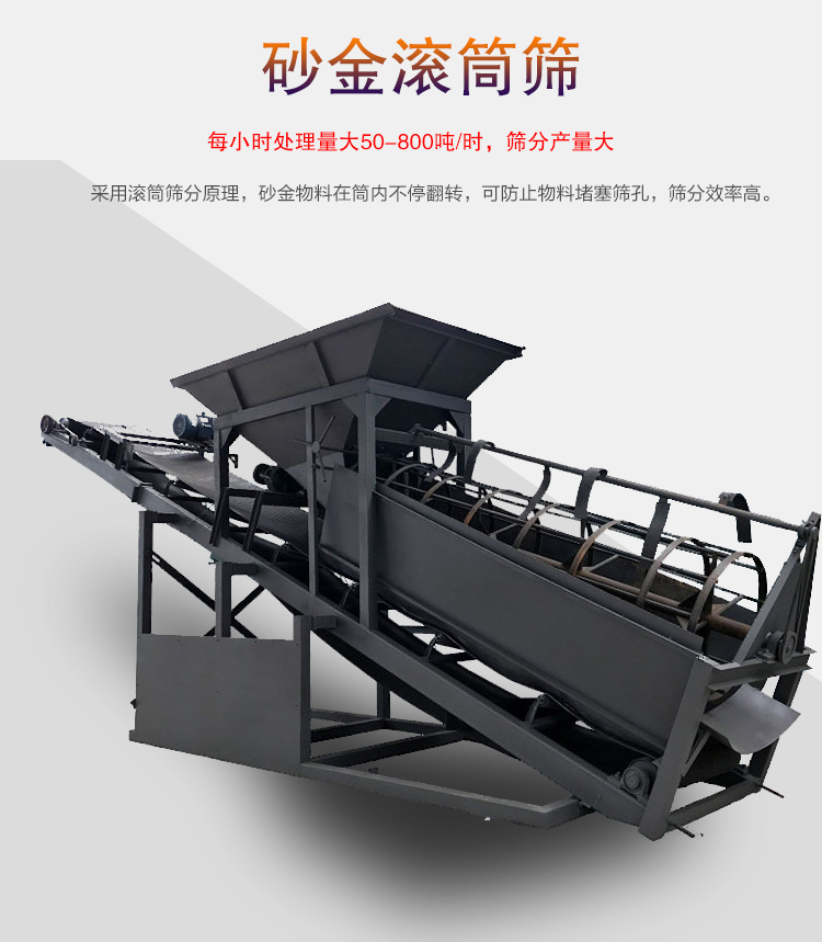 1、采用滾筒篩分原理,砂金物料在筒內(nèi)不停翻轉(zhuǎn),可防止物料堵塞篩孔,篩分效率高。