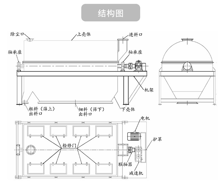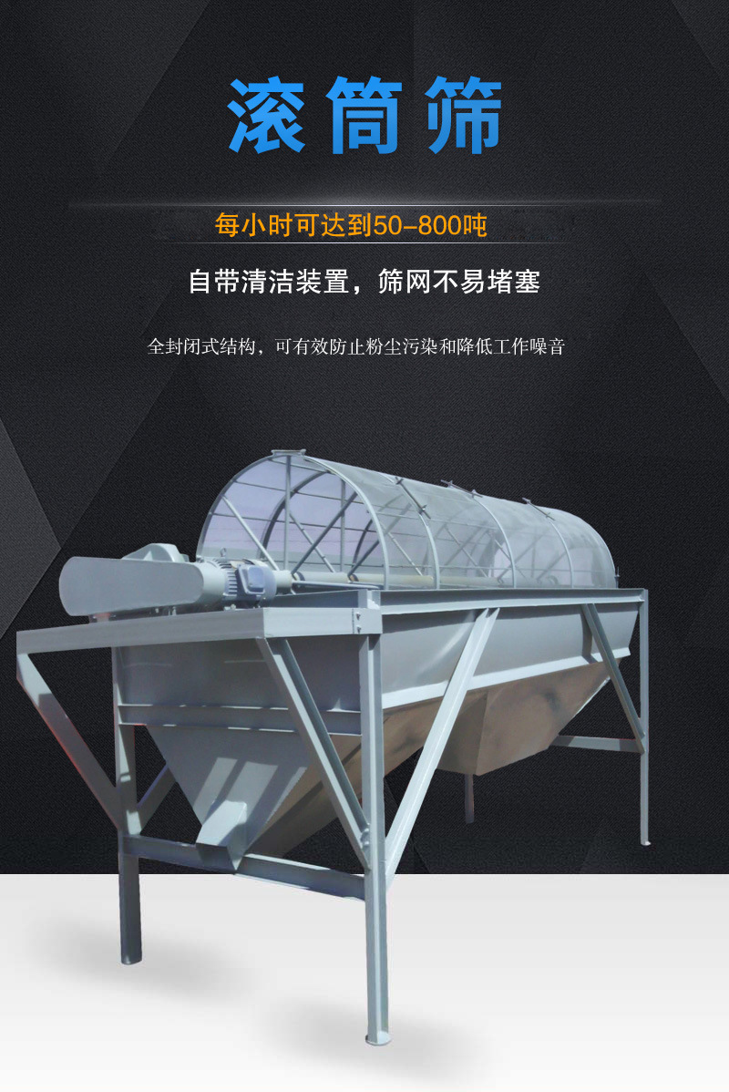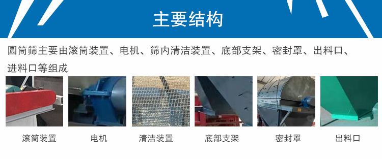 圓筒篩主要由滾筒裝置、電機、篩內(nèi)清潔裝置、底部支架、密封罩、出料口、進料口等組成,筒體呈傾斜放置,并被防塵罩罩住,生產(chǎn)過程中幾乎無粉塵和噪音污染。