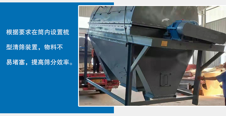1、運用滾筒篩分原理,物料在篩分過程中不停地翻轉(zhuǎn),可以減少物料堵塞。