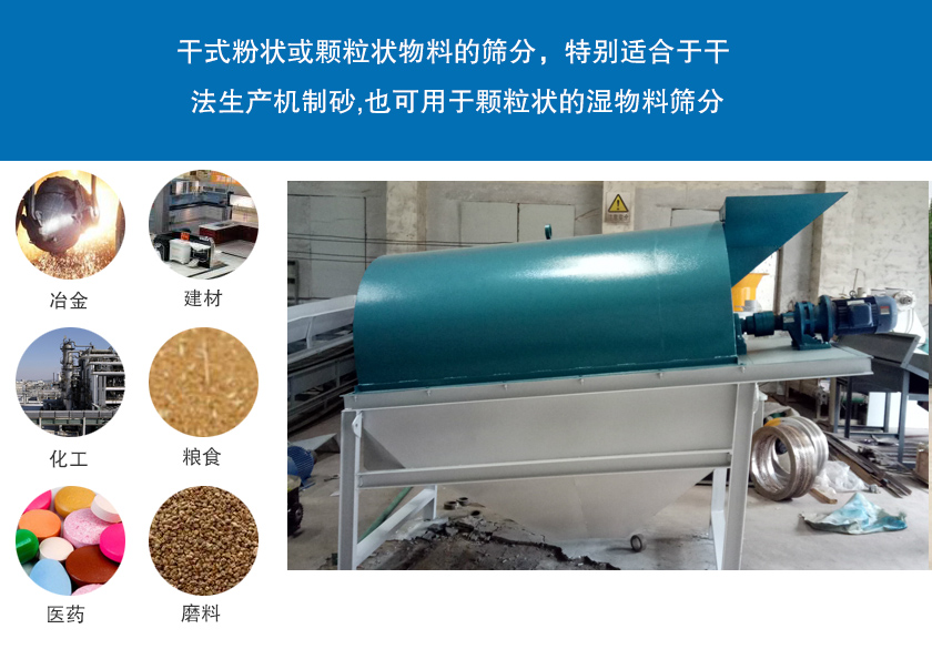 圓筒篩主要是針對物料的顆粒大小進行分級,在篩分潮濕性、粘附性的物料中優(yōu)勢突出,可以達到不粘網(wǎng)、不堵孔的目的,圓筒篩可廣泛應用于冶金、建材、化工、糧食、醫(yī)藥、磨料及化肥等行業(yè)的干式粉狀或顆粒狀物料的篩分,特別適合于干 法生產(chǎn)機制砂,也可用于顆粒狀的濕物料篩分。