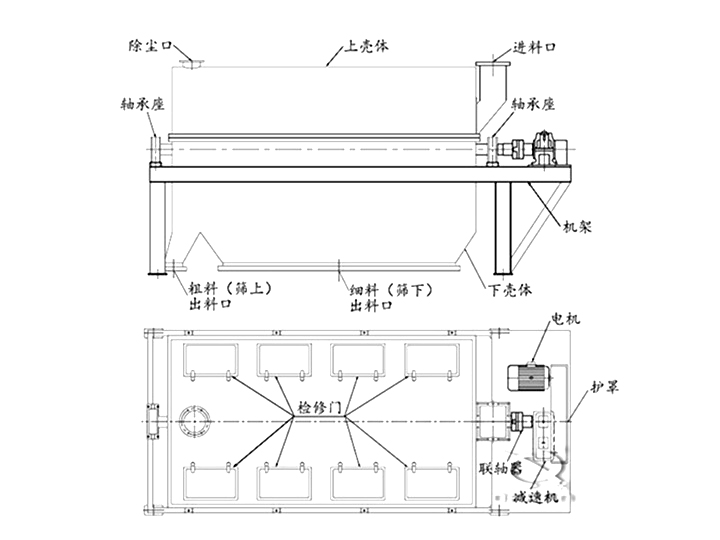無軸滾筒篩主要由電機(jī)、減速機(jī)、滾筒裝置、機(jī)架、密封蓋、進(jìn)出料口組成。