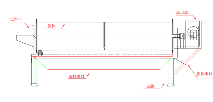 滾筒篩分機(jī)主要是由六角形滾筒、機(jī)架、漏斗、減速器、電動(dòng)機(jī)五個(gè)部分成,破碎的石料進(jìn)入滾筒后,一方面隨著滾筒轉(zhuǎn)動(dòng)而被篩選,靠滾筒旋轉(zhuǎn)的離心力及跳汰作用來篩分物料。一方面粒度大的石料沿著滾筒的斜度向前流動(dòng),通過不同網(wǎng)目的的篩網(wǎng)逐漸被篩出。不大的石料篩出后落入各自的漏斗,然后由人工運(yùn)出或自流送往成品堆。
